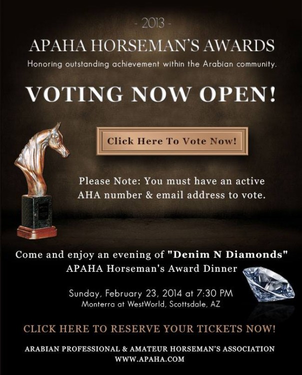 To vote for the APAHA Horseman’s Awards, you’ll need to be a member of the Arabian Horse Association. When you vote, you will need your AHA # and an email address. Click here to vote! We kindly ask you to consider voting for: